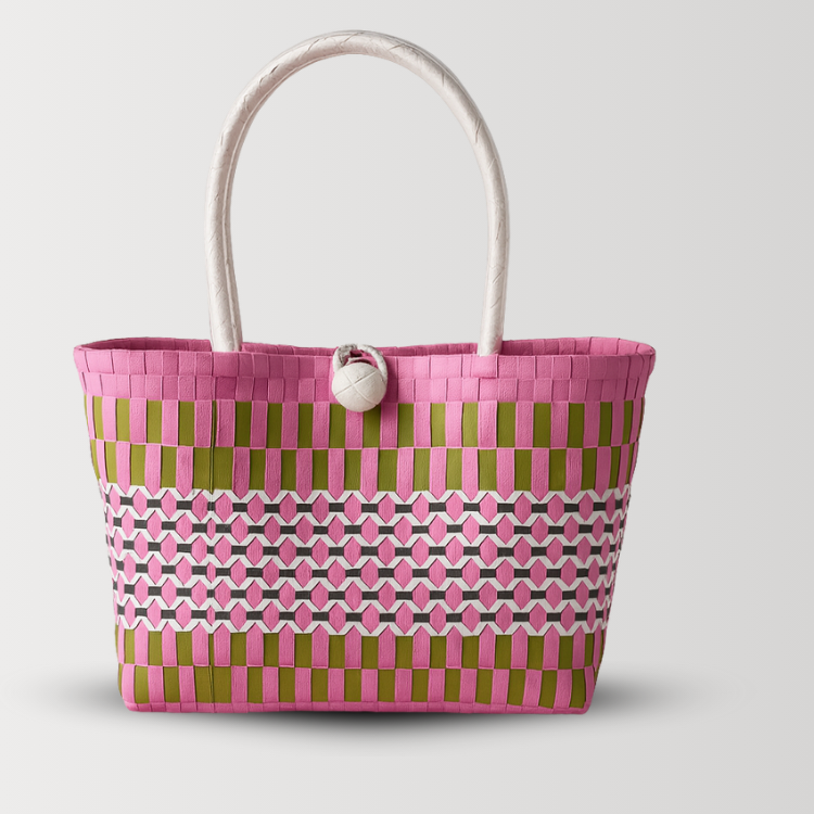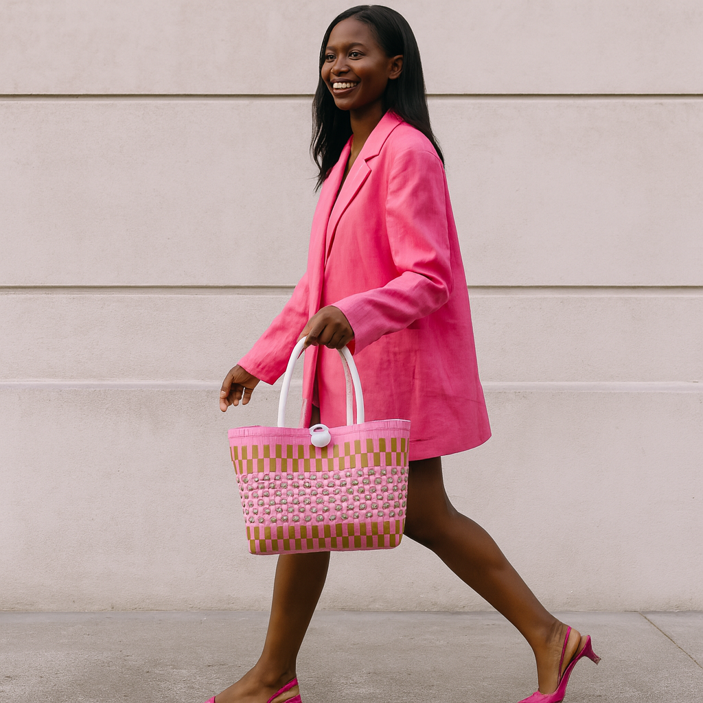 Confectionné en tissage artisanal, mêlant paille et plastique recyclé, il offre une résistance remarquable et une parfaite imperméabilité. Ses tons frais et lumineux – rose, vert et blanc – apportent une touche de modernité et d’énergie à ton style, tout en célébrant le savoir-faire africain.