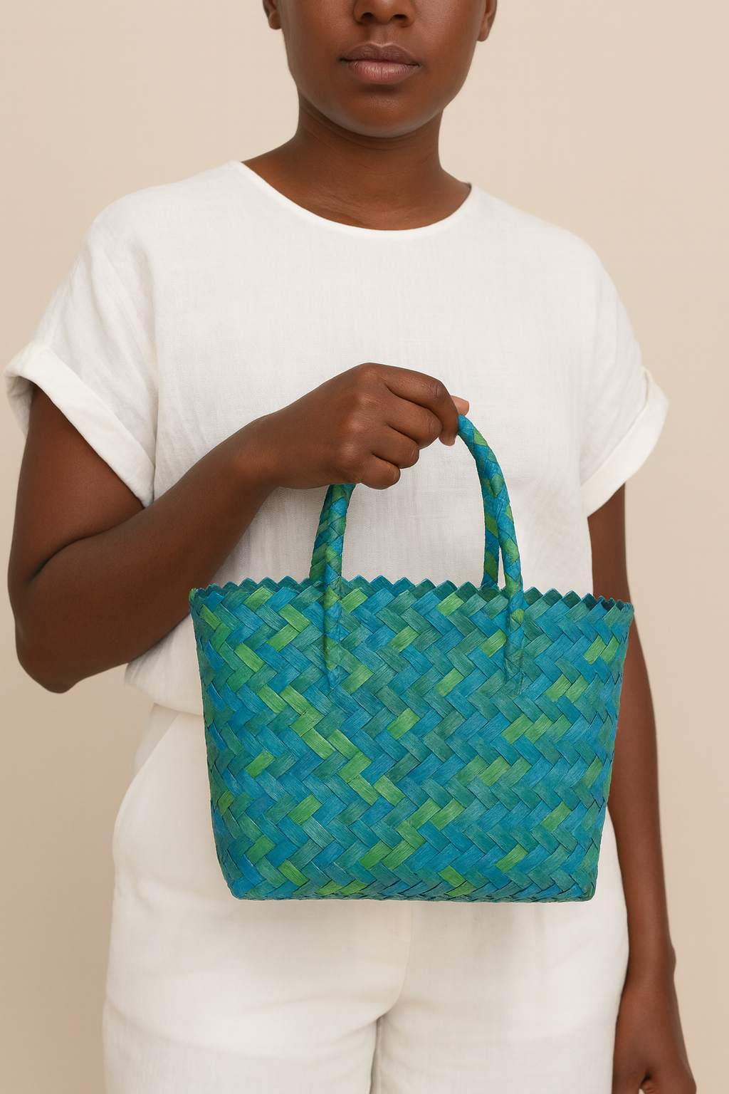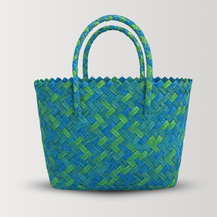 Confectionné en tissage artisanal, il associe paille et plastique recyclé pour garantir résistance, imperméabilité et durabilité. Ses couleurs intenses vert et bleu évoquent la force de la nature et apportent une touche moderne et rafraîchissante à ton style.